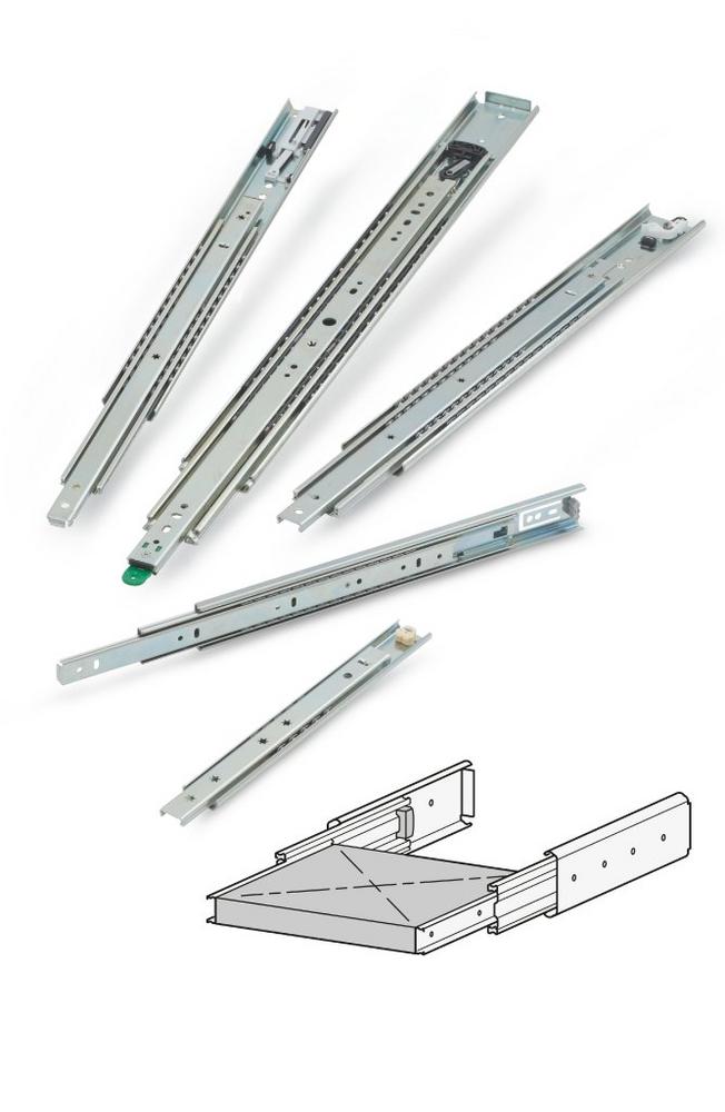 Je nach Auszugslänge, die zwischen 300 und 1500 mm wählbar ist, bestehen die Teleskopschienen aus zwei, drei oder vier ineinander laufenden Einzelschienen. Wälzlagerkugeln, die durch Kugelkäfige sicher eingebettet sind, übernehmen dabei die Führung.